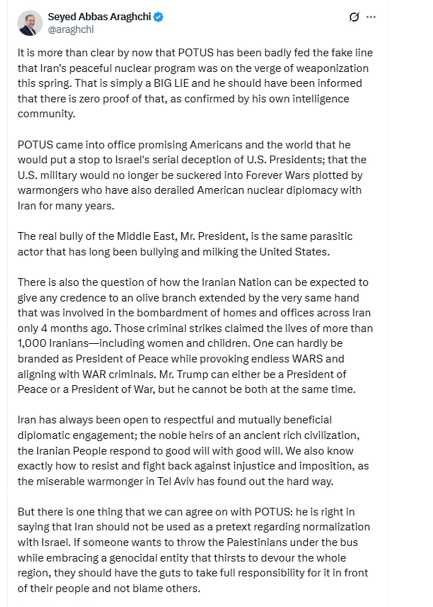 پیام سید عباس عراقچی وزیر امور خارجه در شبکه ایکس راجع به اظهارات روز گذشته رئیس جمهور آمریکا در کنست و شرم الشیخ: آقای ترامپ یا میتواند رئیسجمهور صلح باشد یا رئیسجمهور جنگ؛ نمیتواند همزمان هر دو باشد