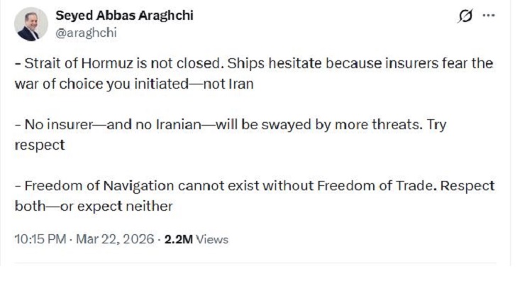 تنگه هرمز بسته نشده است. توقف کشتیها بهخاطر ترس شرکتهای بیمه از «جنگ انتخابی» است که شما آغاز کردهاید، نه ایران.