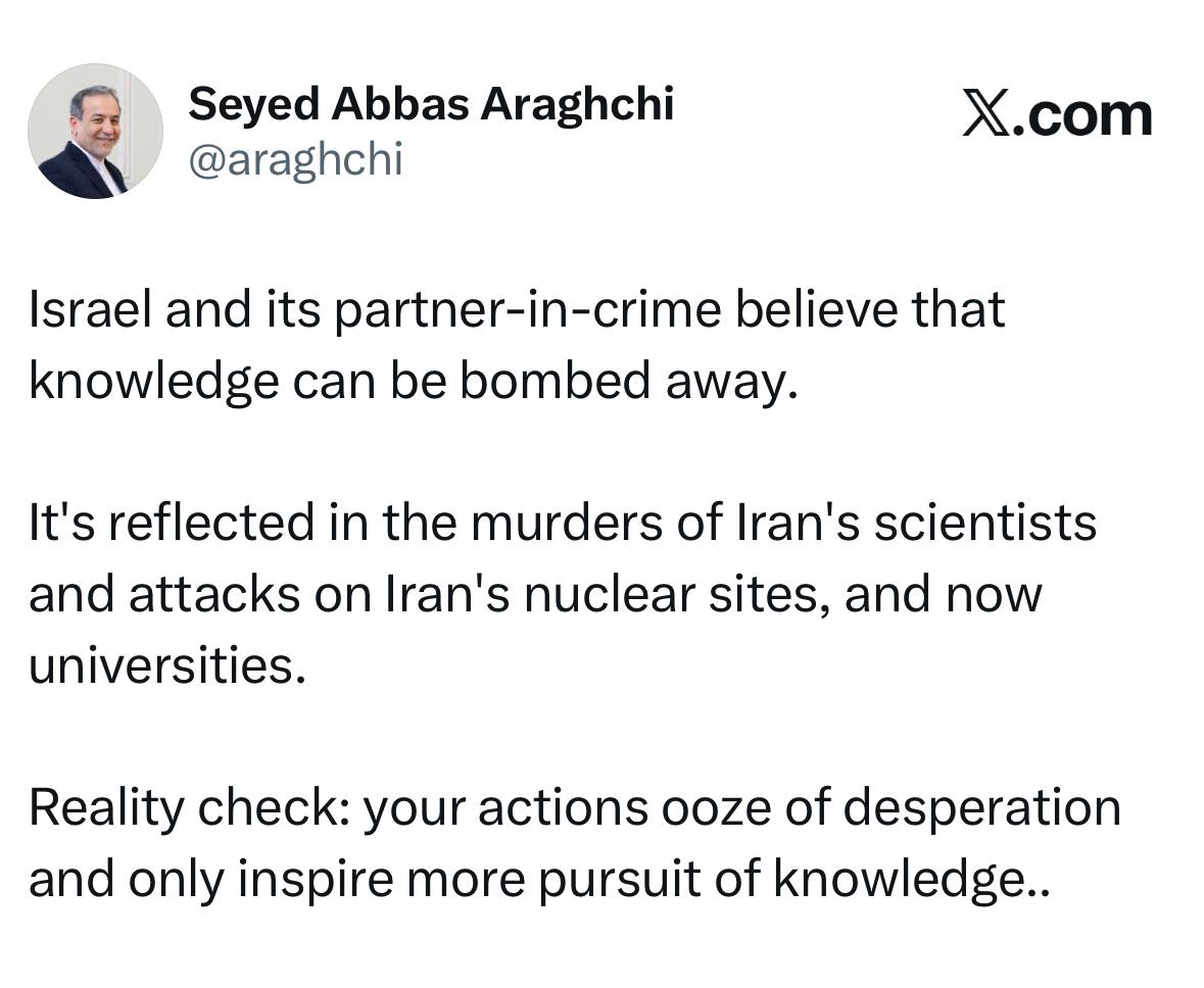 واکنش سید عباس عراقچی وزیر امور خارجه به بمباران دانشگاهها توسط امریکا و اسرائیل؛