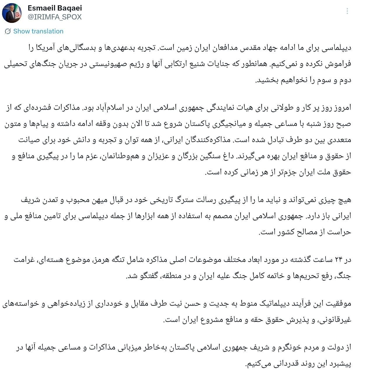 اسماعیل بقائی سخنگوی وزارت امور خارجه با ارائه گزارش کوتاهی از مذاکرات ایران-آمریکا در اسلامآباد پاکستان در شبکه ایکس نوشت: