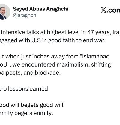 در ۲۴ ساعت گذشته در مورد ابعاد مختلف موضوعات اصلی مذاکره شامل تنگه هرمز، موضوع هستهای، غرامت جنگ، رفع تحریمها و خاتمه کامل جنگ علیه ایران و در منطقه، گفتگو شد.