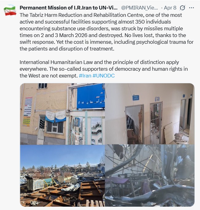 مرکز کاهش آسیب و بازتوانی تبریز، به‌عنوان یکی از فعال‌ترین و موفق‌ترین مراکز کشور که از نزدیک به ۳۵۰ فرد مبتلا به اختلالات مصرف مواد حمایت می‌کرد، در روزهای ۲ و ۳ مارس ۲۰۲۶ مورد اصابت چندین موشک قرار گرفت و ویران شد. خوشبختانه به‌دلیل واکنش سریع، تلفات جانی گزارش نشد؛ اما هزینه‌های وارده بسیار سنگین است، از جمله آسیب‌های روانی برای بیماران و اختلال در روند درمان.